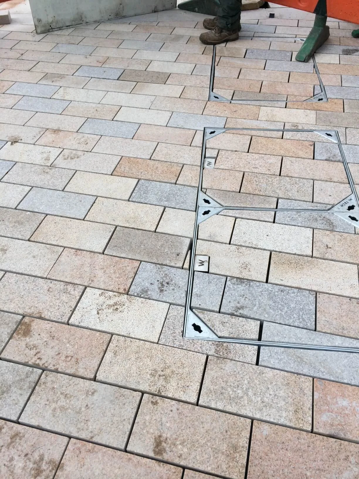 Installing rectangular stone pavers on a concrete surface with metal frame sections marked with letter W, and a worker's legs and shoes visible in the background.