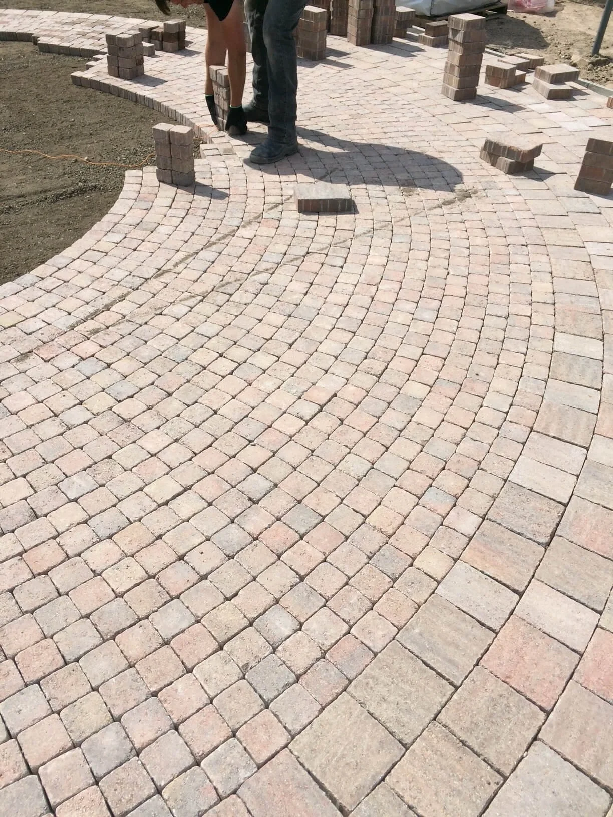 Workers installing a curved brick paver walkway with pink and gray bricks.