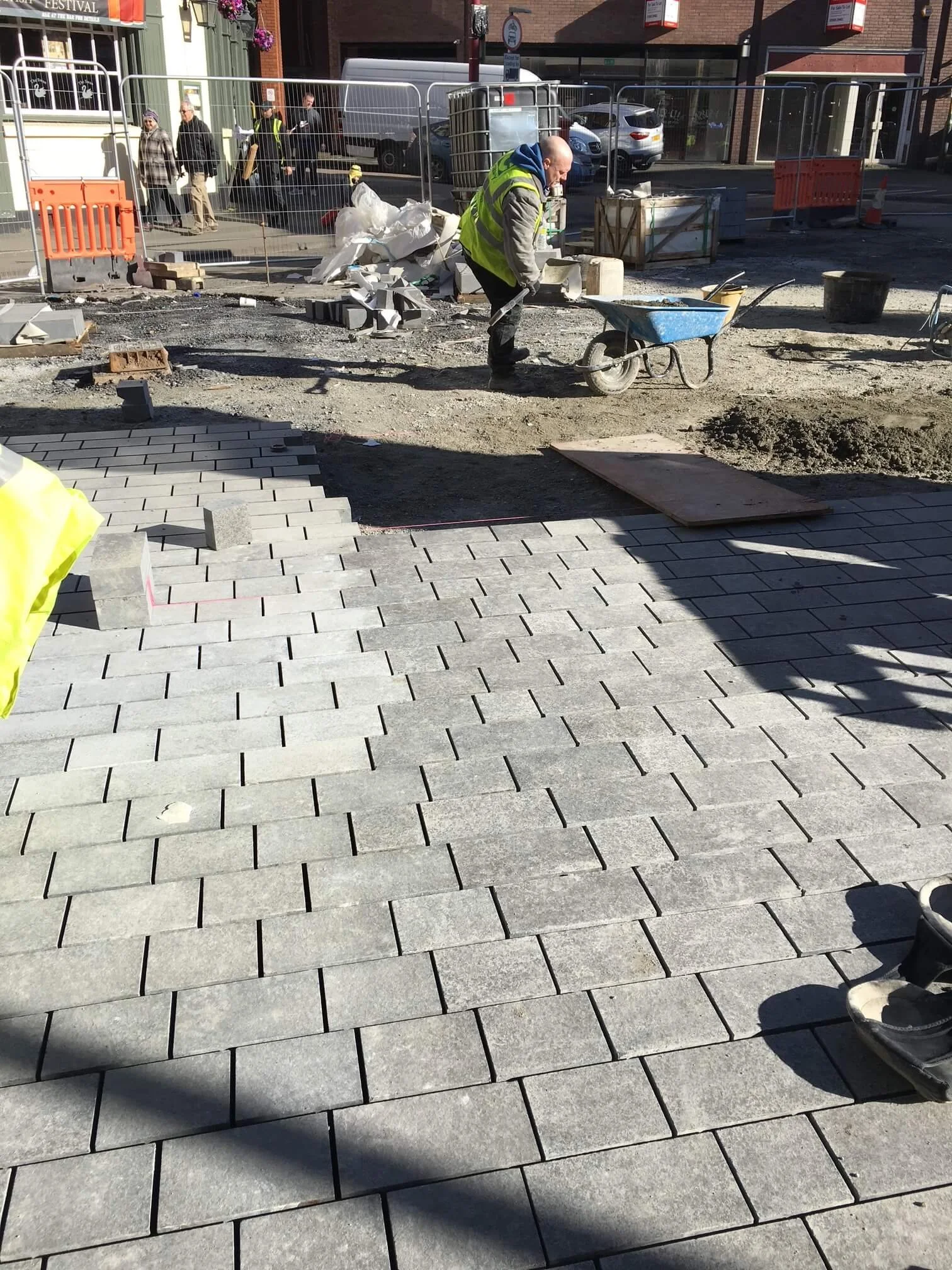 Construction worker in a yellow vest installing gray paving stones on a sidewalk, with construction barriers and people in the background.