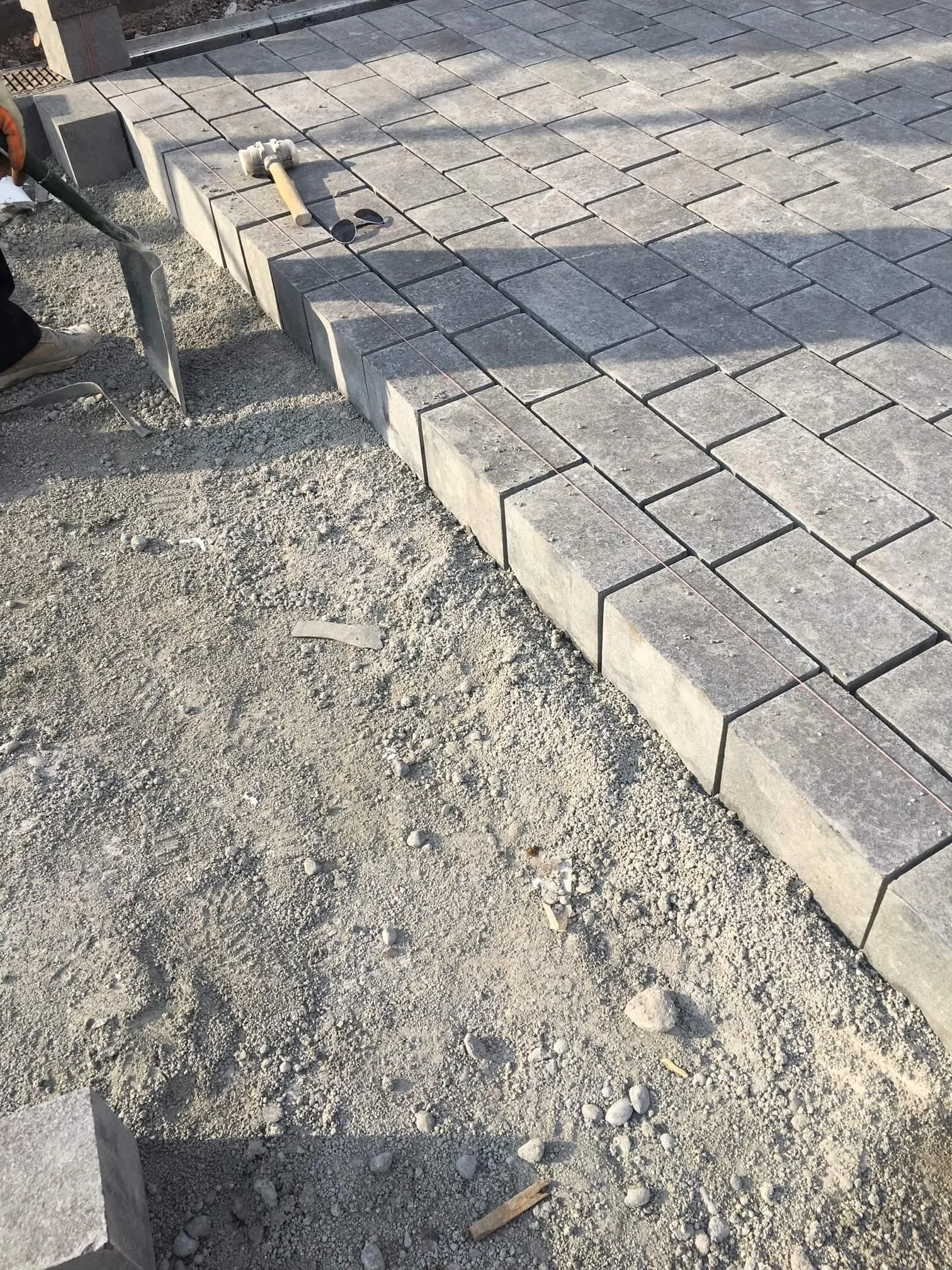 Construction site with newly laid gray paving stones for a sidewalk, with some tools and construction materials scattered around.