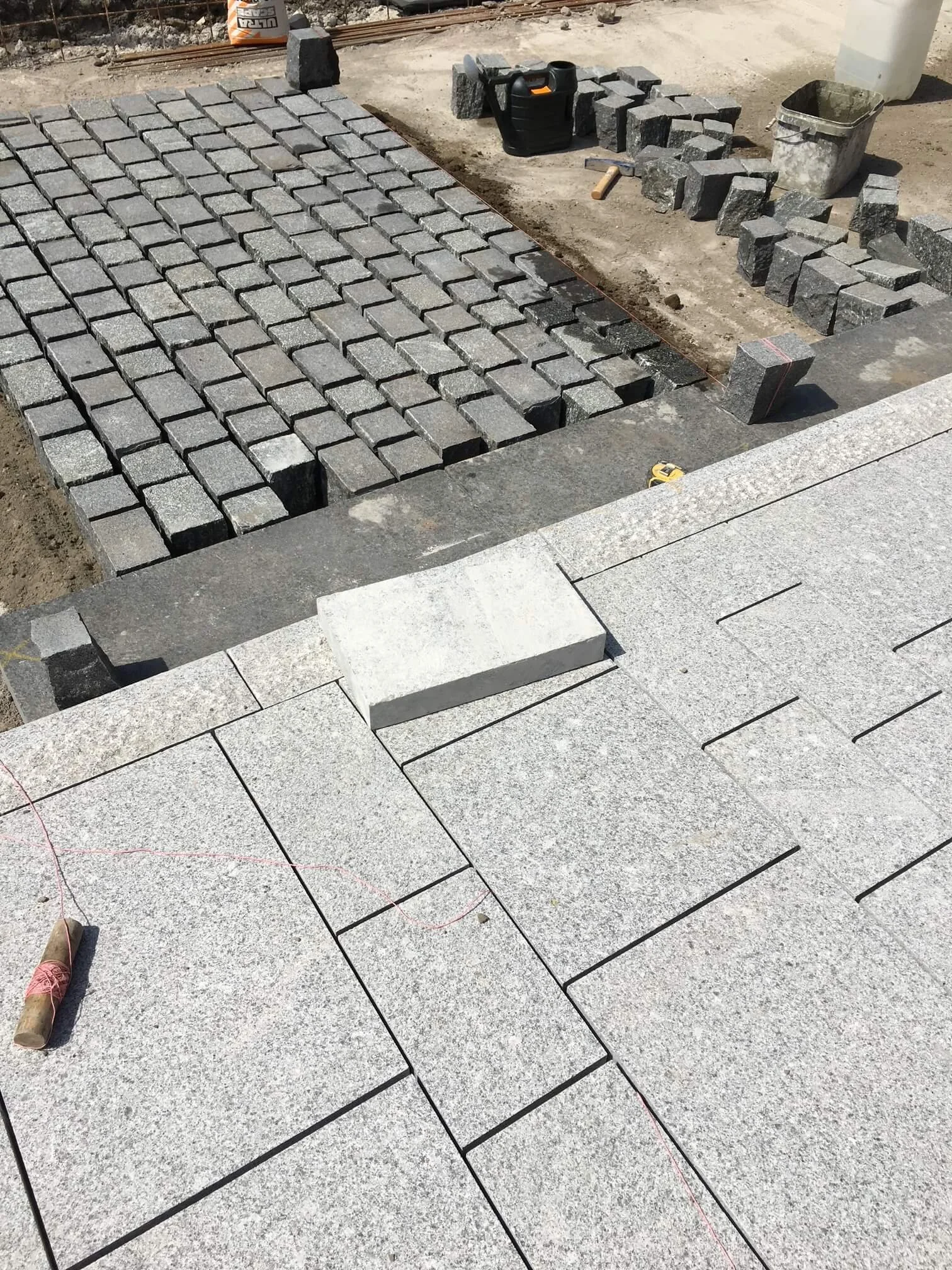 Construction site with gray stone paving and brickwork in progress, tools and materials scattered around.