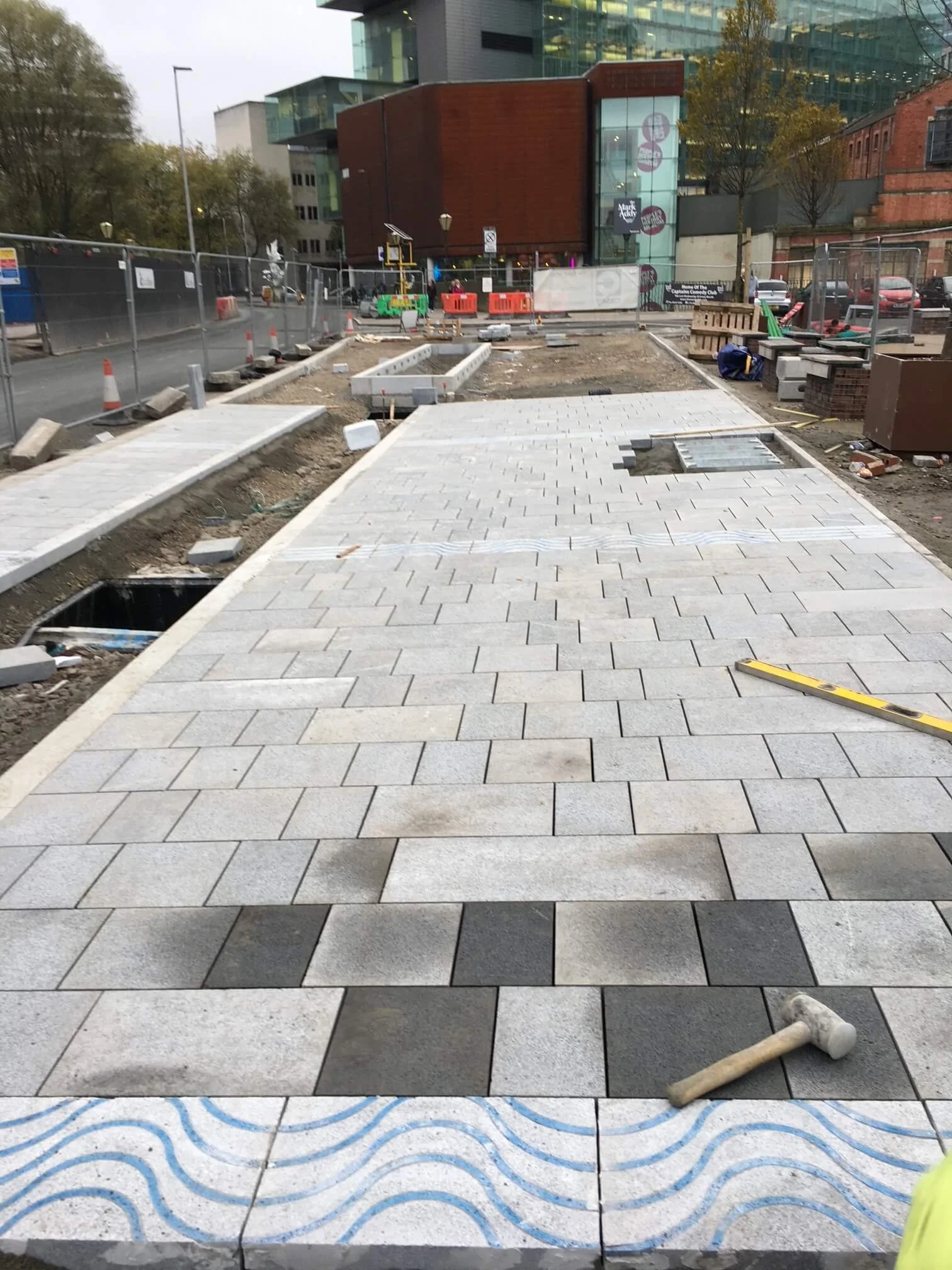 Construction site with a newly paved sidewalk made of gray bricks, some bricks are not yet installed, metal and concrete barriers, construction tools, and vehicles in the background.